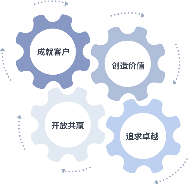 成就客户是一切决策的出发点,,,,创造价值是衡量所有工作的标准,,,,追求卓越是我们做事做人的态度,,,,开放共赢是我们的格局也是最终的结果。。。价值观的齿轮环环相扣,,,,推动着组织里的每个人不断向前。。。。