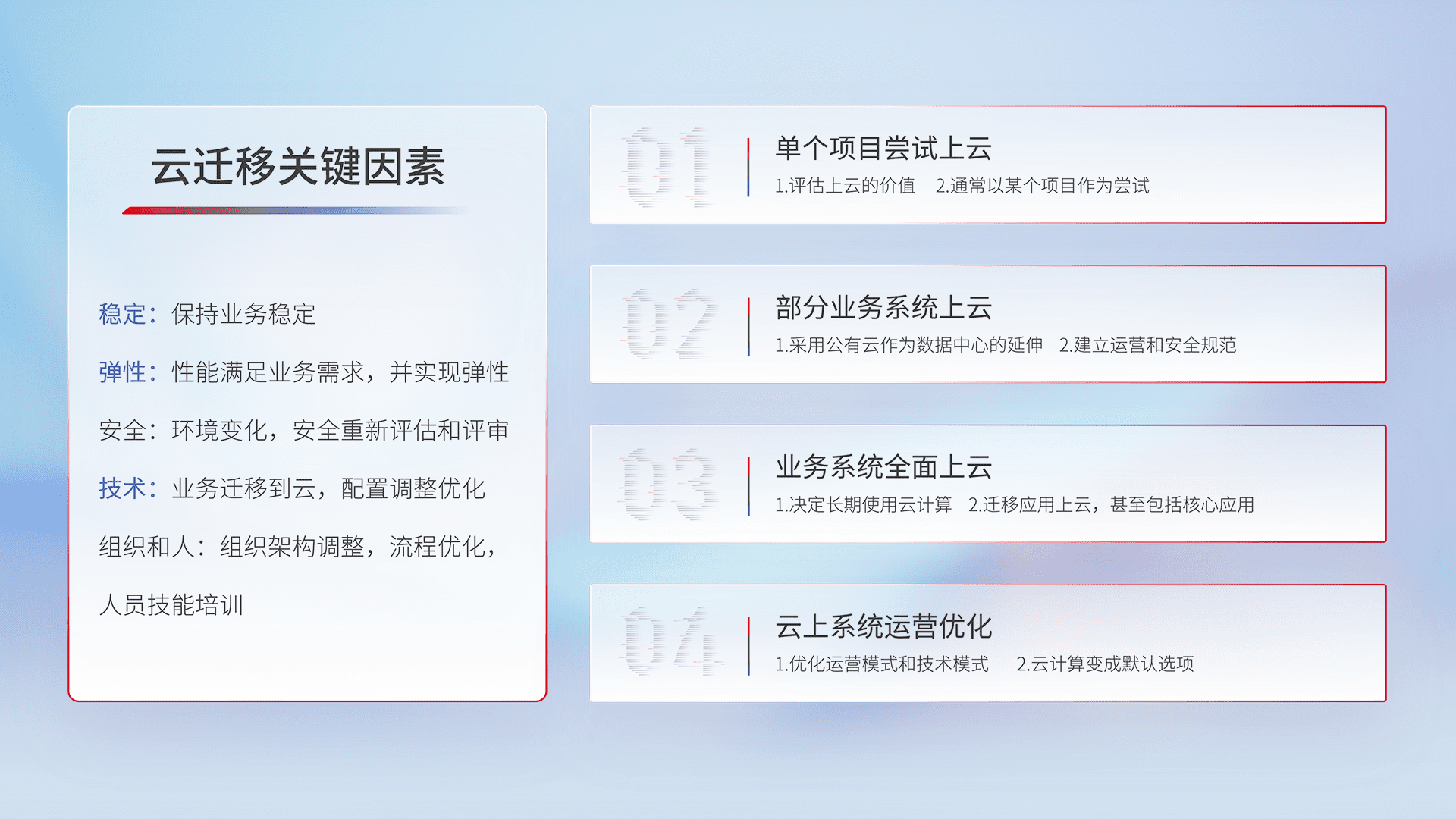 结合实际业务,,从规划设计、、云平台选型、、云原生改造、、、、数据迁移、、、集成交付,,,,迁移全过程为客户识别最佳上云路径,,,,做好风险识别管理,,设计网络架构、、身份权限、、、安全审计合规、、、操作审计、、、、日志审计、、监控告警策略、、、、多站点容灾设计等,,,对云上基础设施进行整体规划,,提升IT治理水平,,,,以满足弹性、、、、高可用、、、、高性能的需求。。。