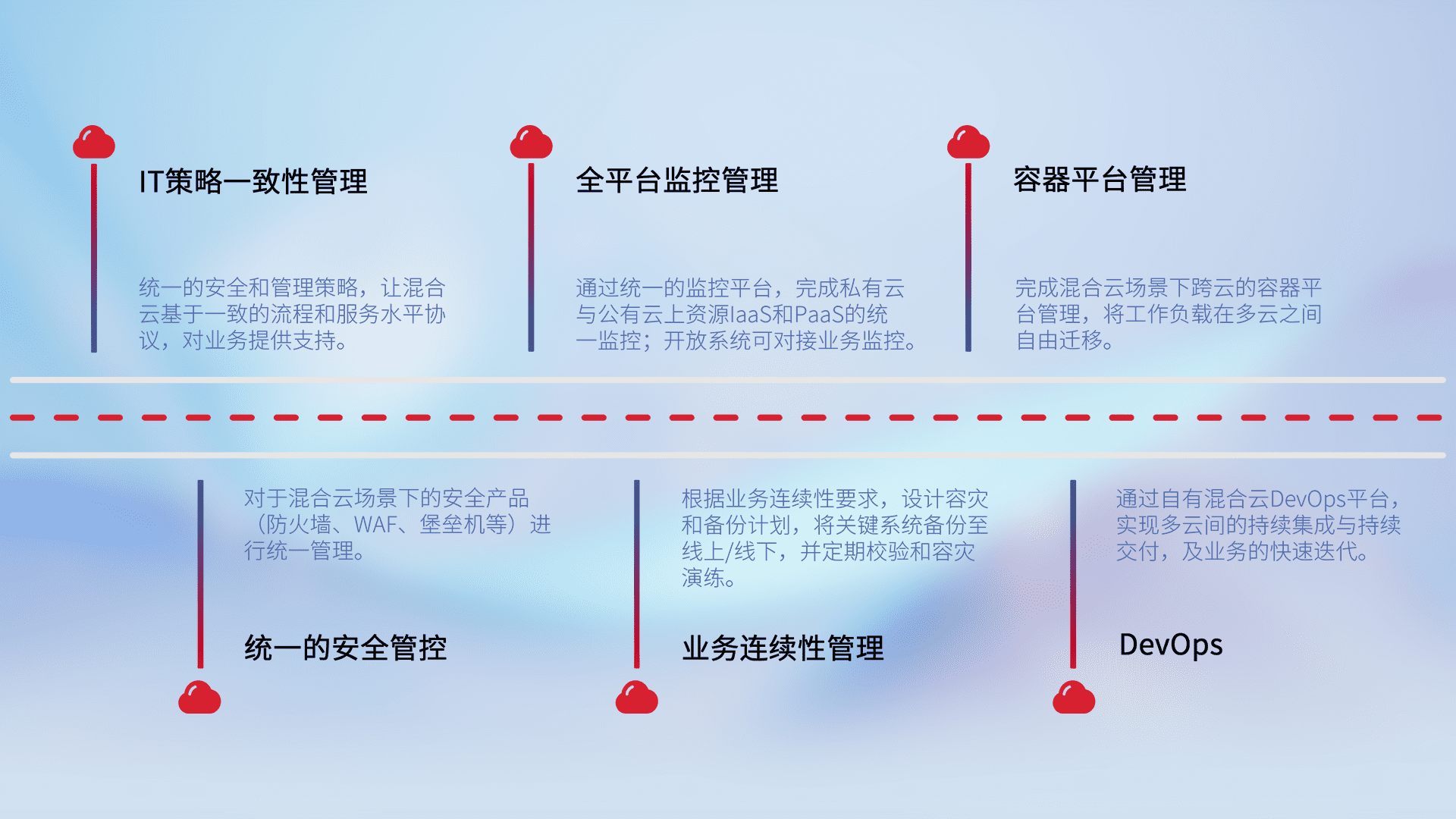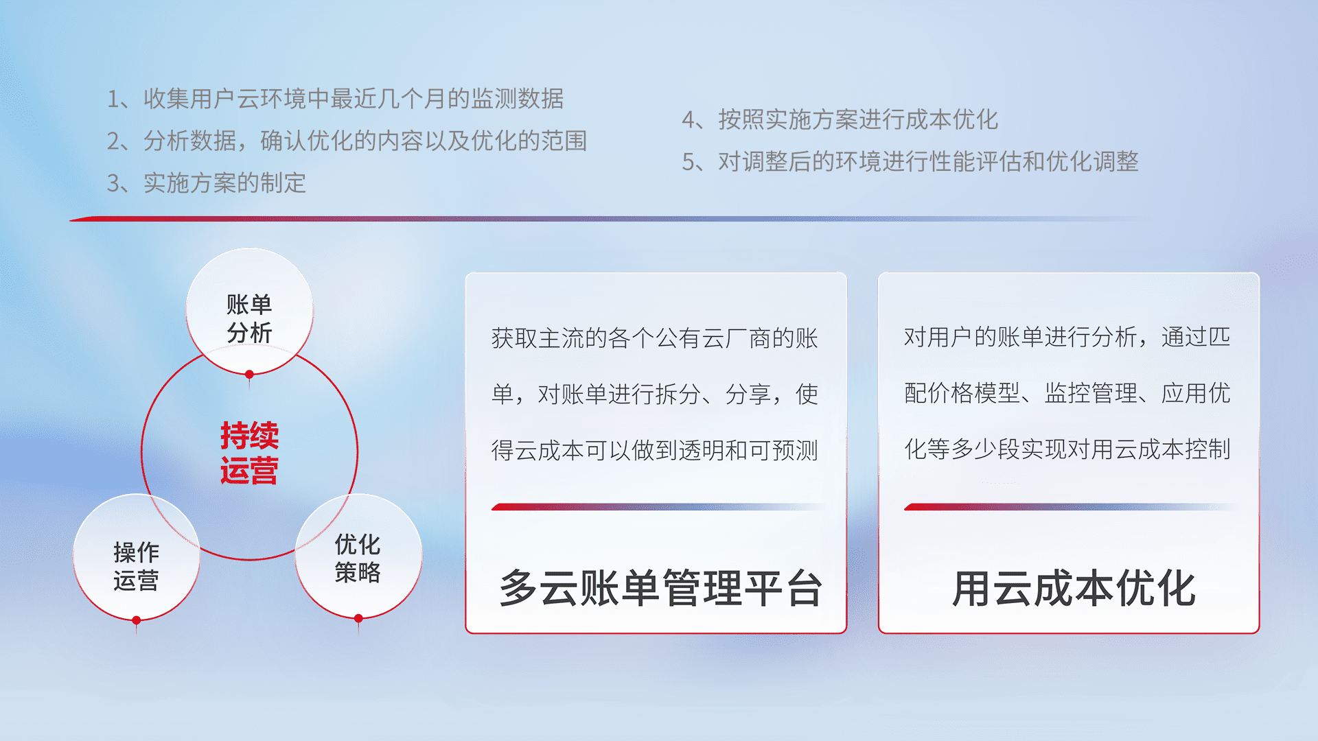 通过多云纳管,,,以统一的资源数据模型把客户的云资源进行抽象和封装,,,,进而实现对多云资源的统一操作,,保障云资源管理的可靠性、、、、稳定性与可用性。。。量身定制化运维内容,,配置、、、开发运维、、补丁管理、、、、备份、、监控、、、认证和访问管理、、、审计和日常巡检等,,,,保障在用云过程中的可靠度,,,稳定度以及高可用率。。