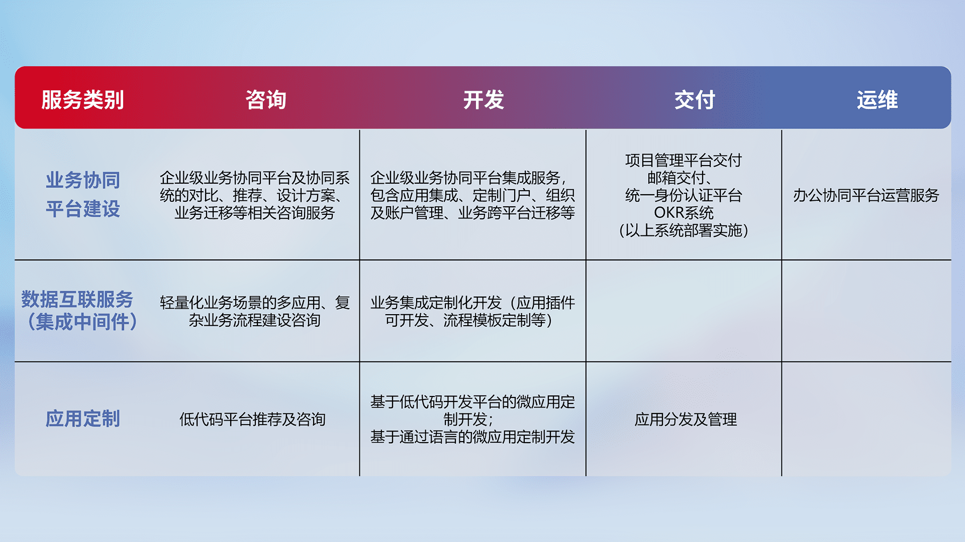 针对钉钉、、、企微、、、IDaas等平台级产品提供产品的规划、、、、方案、、交付、、定制化开发等服务,,,,实现如统一协同办公、、、智能客户服务、、、混合会议管理、、、智能数据查询、、等业务场景,,,实现数字化转型。。。。